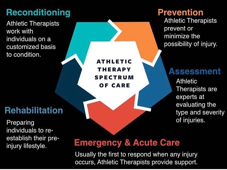 Athletic Therapist’s goals are to reduce acute and chronic pain while getting you back to your functional and sport specific activities. Since we are specialists in the Muskuloskeletal system we integrate the whole body to ensure the best possible outcome for recovery. As an athletic therapist I am the person who will enter onto the field when an athlete is hurt and I am qualified to help them. In addition to helping them safely off the field I will work with the athlete to bring the athlete back to full playing potential using manual therapies and functional exercises. Another goal of ours is to integrate prevention programs into teams to reduce the amount of injuries.